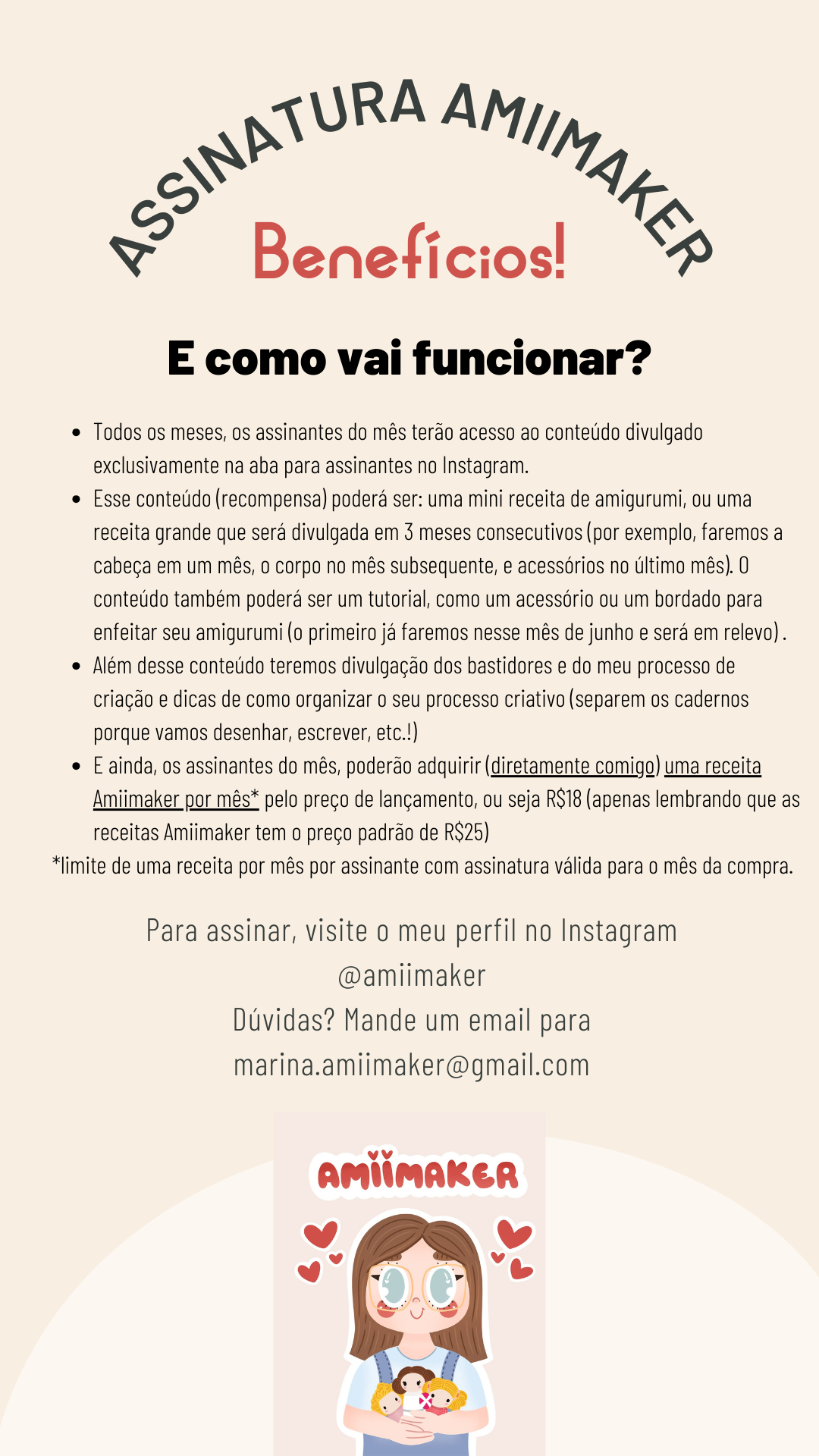 A segunda novidade é que a partir de agora você pode ser um assinante Amiimaker e ter acesso a conteúdos exclusivos mensalmente. Todos os meses faremos algo novo juntos. De receitas gratuitas a tutoriais e dicas, seremos uma comunidade criativa e acolhedora para aprendermos juntos. Aumente as imagens e vem saber mais!